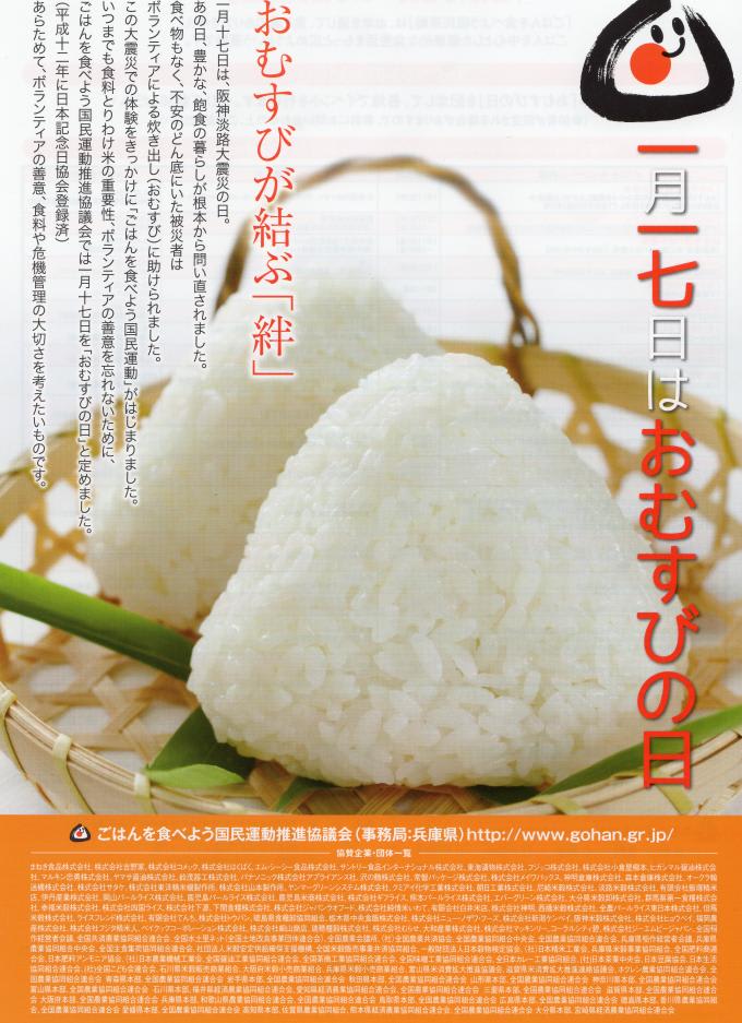いつまでも食料とりわけ米の重要性、ボランティアの善意を忘れないために、ごはんを食べよう国民運動推進協議会では1月17日を「おむすびの日」と定めました。